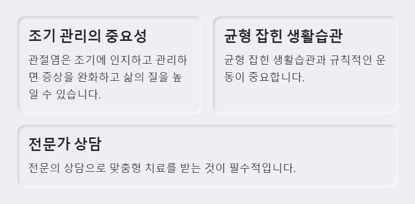 3. 의료 상담: 관절염 증상이 느껴진다면 조기에 전문의와 상담하여 적절한 치료를 받는 것이 중요합니다.